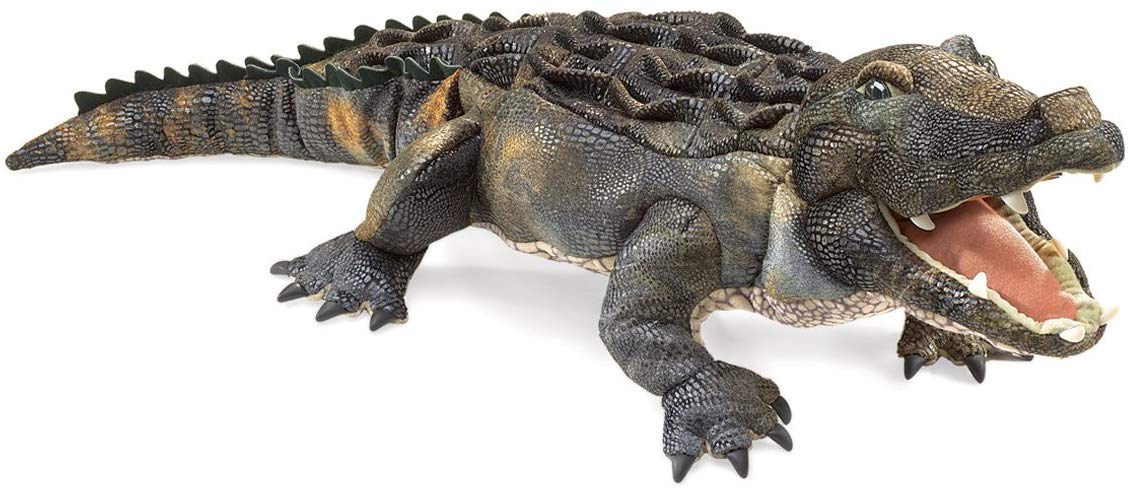 The nearly life-size Folkmanis American Alligator puppet crouches at the riverbank ready to make a splash in your home. This award-winning puppet has realistic design details including soft sculpted plush with velour ruching on top of the back to resemble its armor of embedded bony plates or scutes. Additionally, flexible molded claws and teeth give the puppet an impressive quality. For added play value, utilize the two underside access points with both hands to work mouth and tail simultaneously. Have fun with this carnivorous creature, mimicking its predatory ways with the wide opening jaws, snappy teeth and swaying tail.