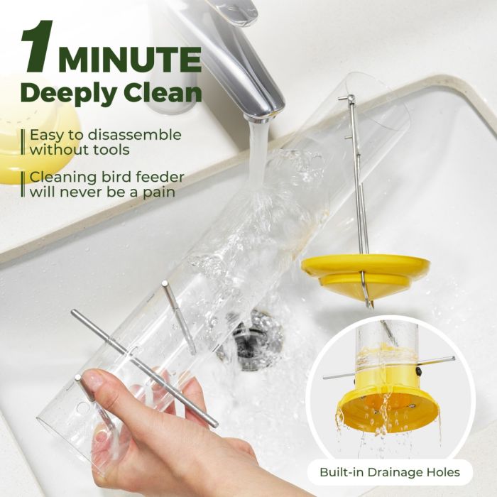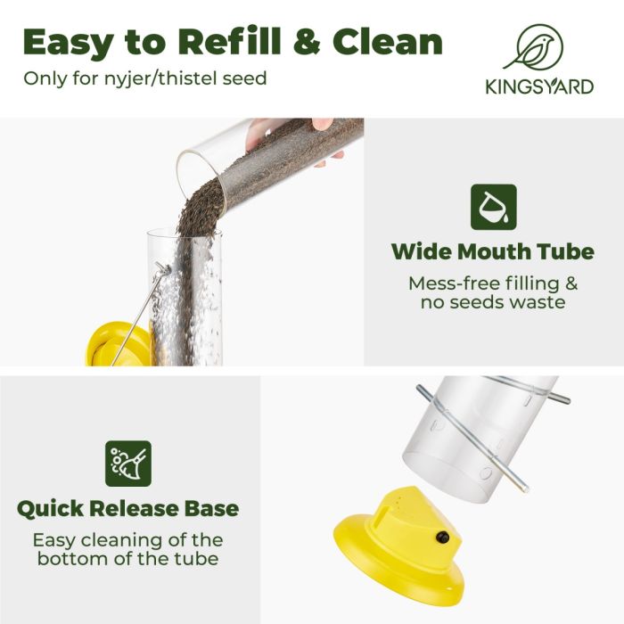 - Narrow ports prevent rainwater while accommodating nyjer seeds.