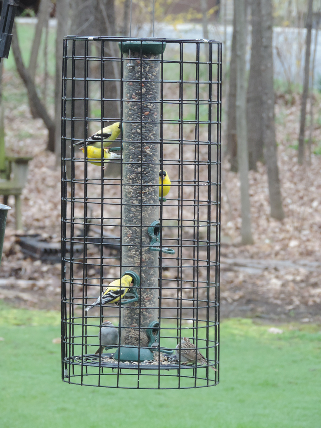 This product is designed to deter black and grey squirrels from your feeder, chipmunks and red squirrels are small enough to gain access. Birds Choice wire cage to keep out the grackles, starlings and other big birds. Comes with hardware to attach tube feeders, suet feeders or other feeders to the base, which also serves as a perching plate. Slotted top to feed the hanger of the feeder through for hanging. Wire is 1 1/2 x 1 1/2