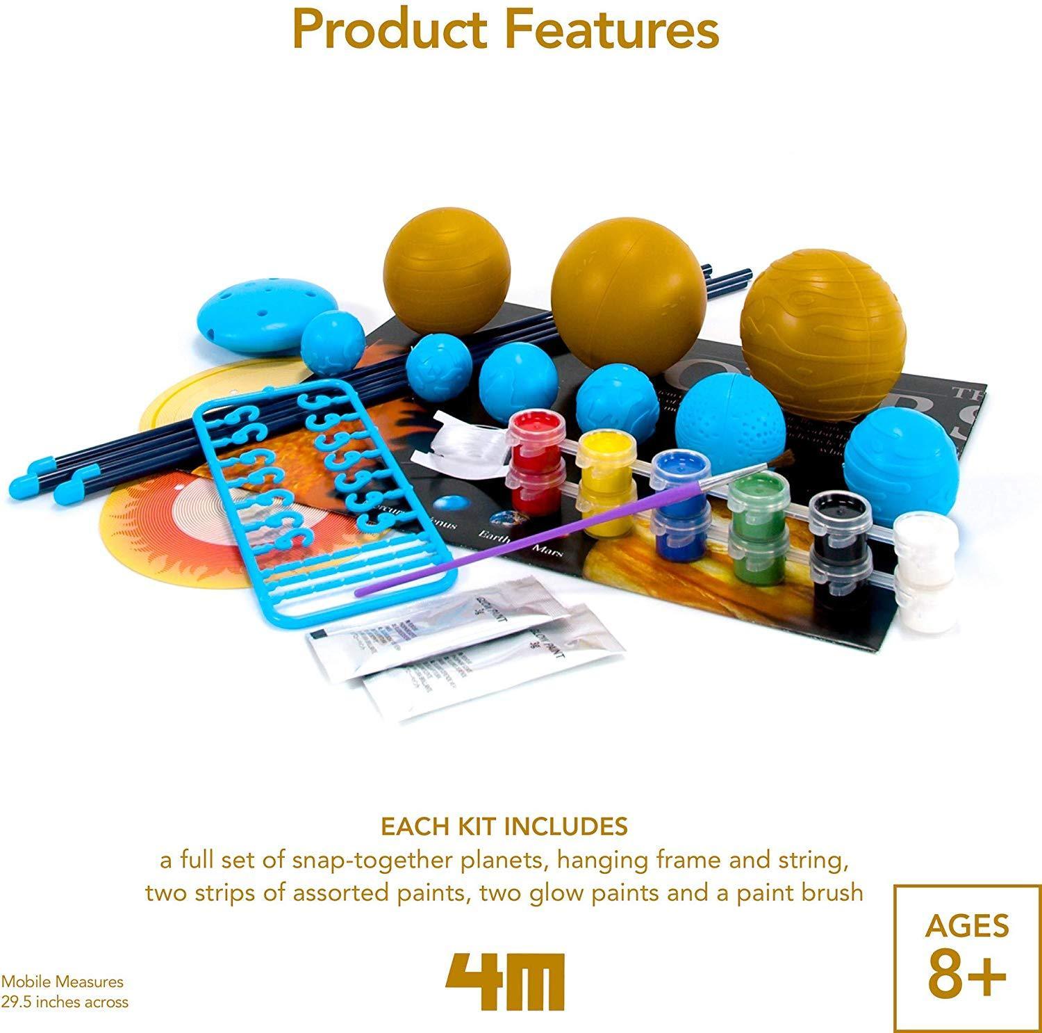 Build your own glow-in-the-dark 3D Solar System Mobile with this educational science kit by 4M. This amazing kit includes a full set of snap-together planets, hanging frame and string, two strips of paint, two glow paints and a paint brush. Kit also includes a bonus poster with solar system facts, painting and assembly instructions. Assembled mobile has a span of 29-1/2 inches. For ages 8 and up.