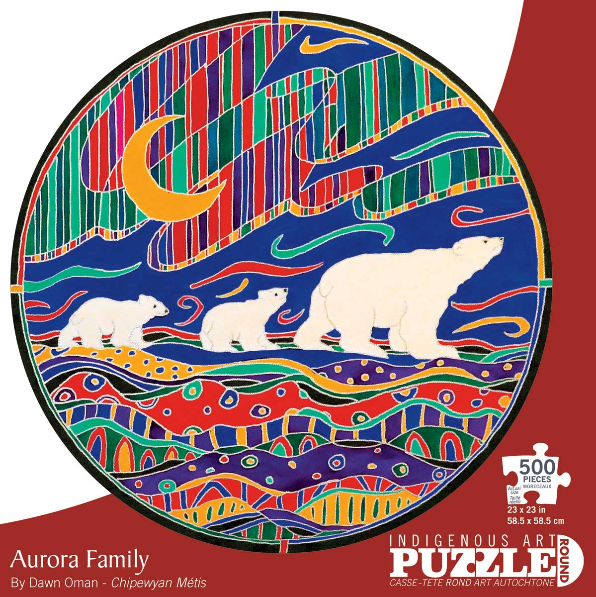 Authentic Indigenous Art. Artist's cultural background: Chipewyan. The artist is paid a royalty on the sale of this product. Puzzles are 58.5cm round (23" in diameter), 500 pieces. The artists name, tribal affiliation, and title of the design appear on the front of the box. Designed in Canada, Made in China.