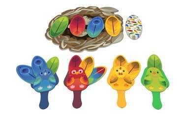Four little birds are missing their tail feathers and need help finding them. Add feathers to your bird each turn by drawing from the deck or trading away your unwanted ones to the nest. Score points at the end of the game based on your colorful collection. The player with the most points wins!