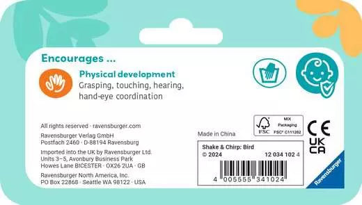 This loveable birdie will become a staple while on the go with your baby. Multisensory details will keep little fingers busy, and the contrasting colours offer engaging visual stimulation. Baby will love to grasp the long, soft and colourful ribbons or the birdie’s wooden ring perch. As the bird is moved or shaken, hear cute chirping sounds that are sure to make baby giggle. Shake & Chirp Bird is great for anytime play, and the handy clip makes it easy to take the fun along wherever you go!