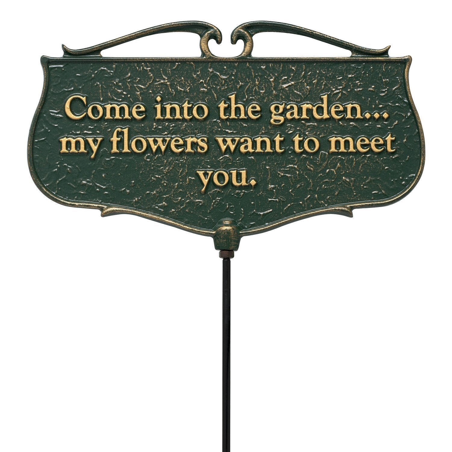 Whitehall Products Come Into The Garden poem sign will create a welcoming atmosphere in your garden. These large, easy to see plaques are a perfect way to personalize your garden area. The inscription is permanently cast into the sign for long lasting use, finished in forest green with gold highlights. A 17″ stake is included. Manufactured from hand cast recycled aluminum.