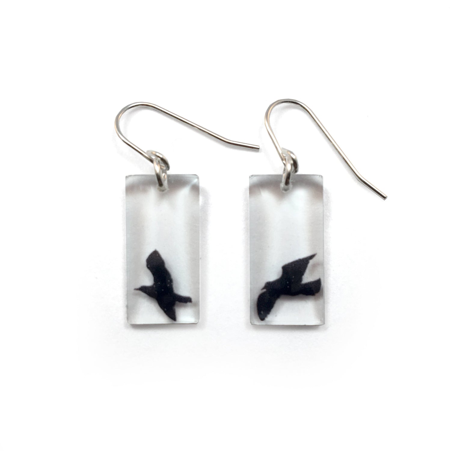 Clear photo earrings handmade with acrylic, resin and a photograph of birds flying. 3/4" tall, 1/8" thick. Sterling silver ear wires.
