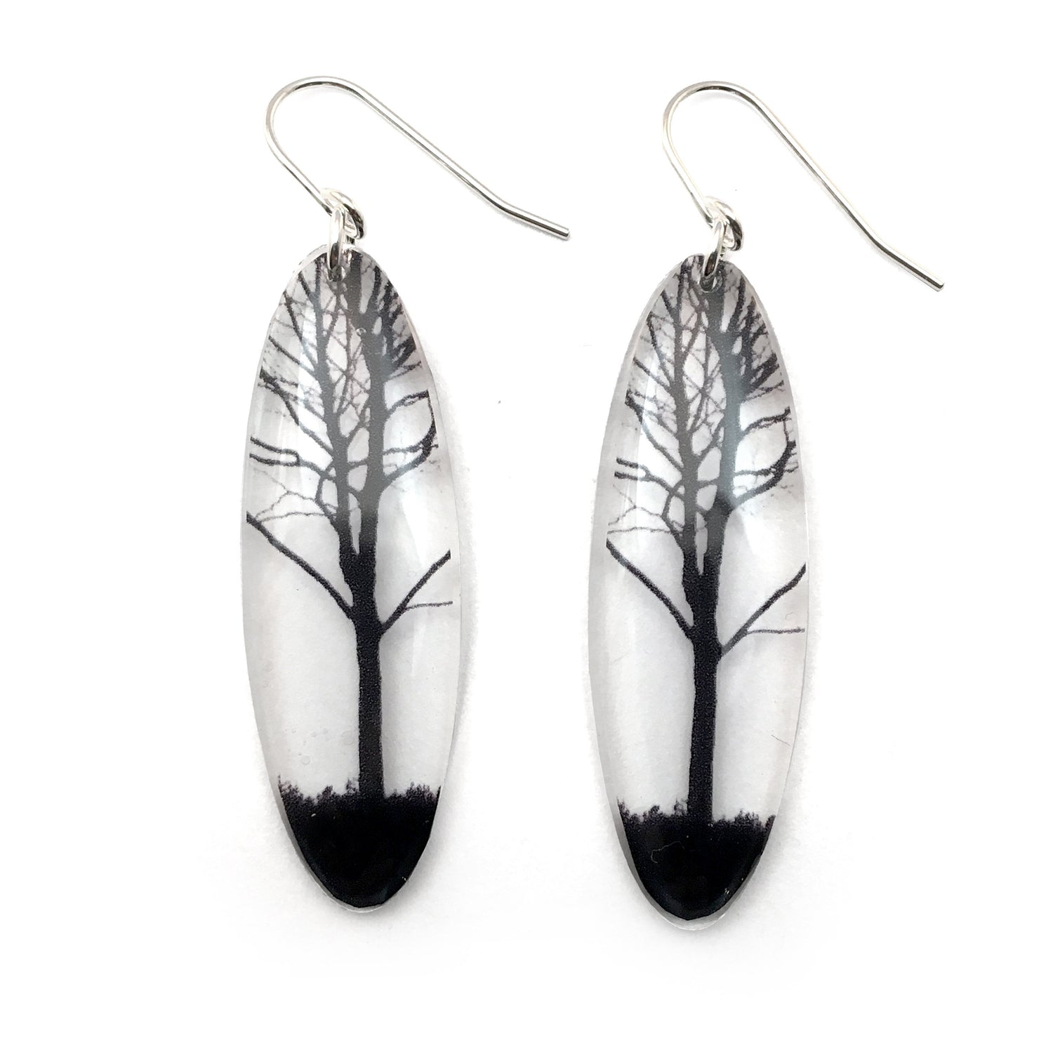 Clear photo earrings handmade with acrylic, resin and a photograph of a tree taken on Vancouver Island, BC. 1-1/2" tall, 1/8" thick. Sterling silver ear wires.