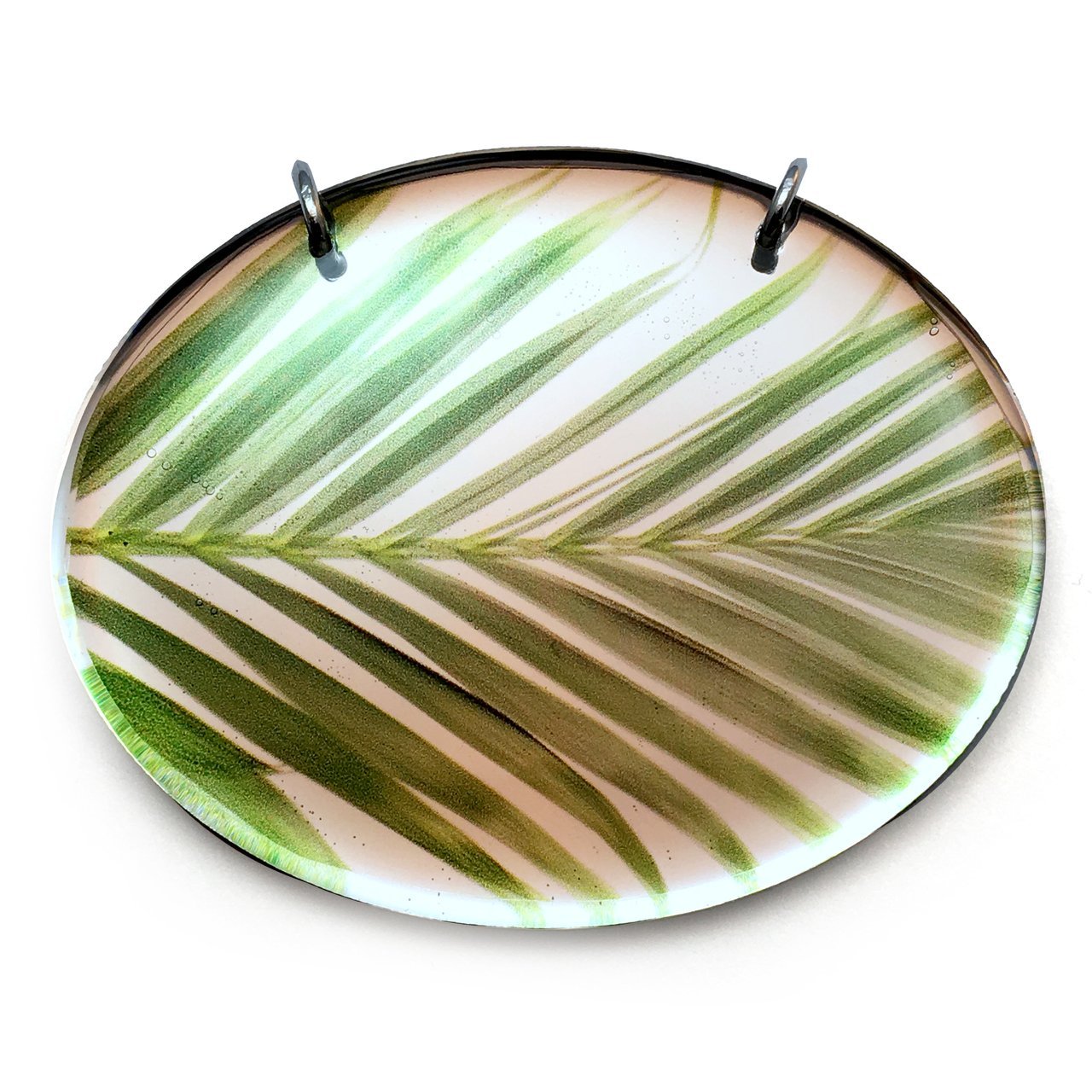 Mirrored photo pendant: handmade with acrylic, resin and a photograph of a palm leaf. 1-1/2" wide, 1/8" thick.
