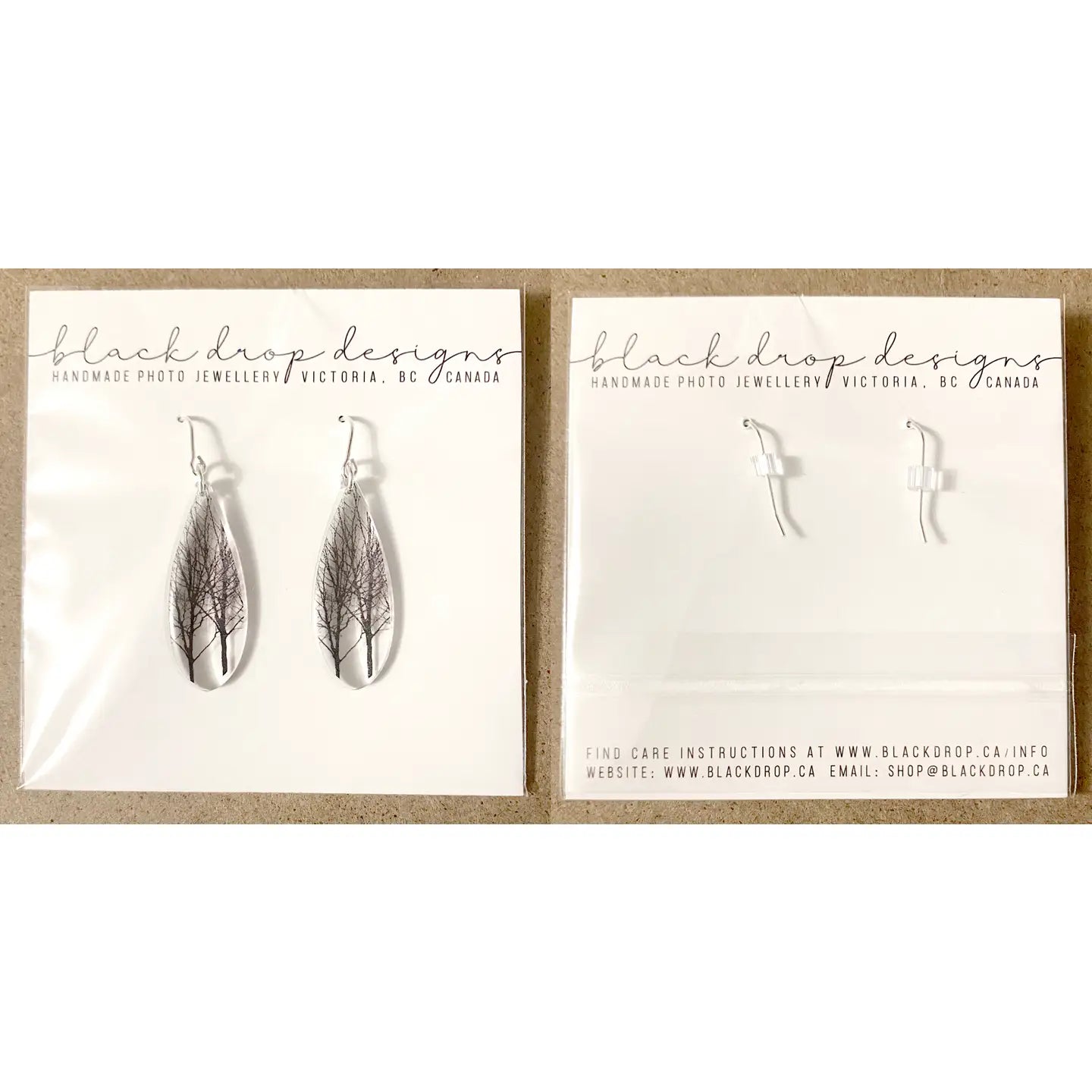 Clear photo earrings handmade with acrylic, resin and a photograph. 1-1/2" tall (not including ear wires), 1/8" thick. Sterling silver ear wires. There is an additional photo of similar earrings being worn as well as a pair of earrings as they come, packaged.