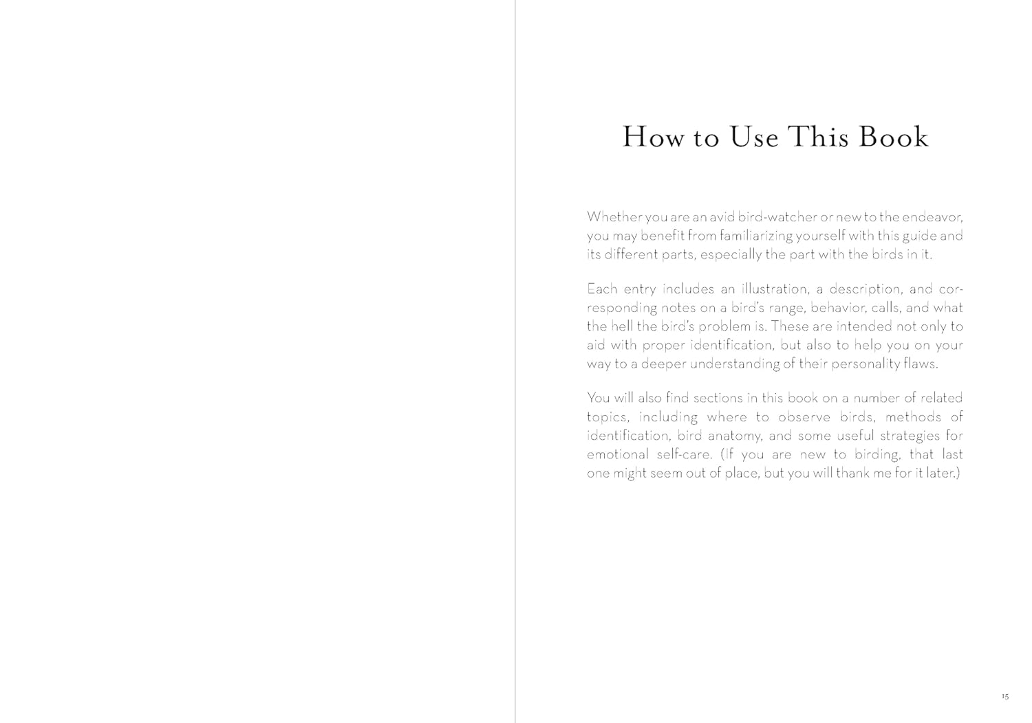 ENTERTAINING AND EDUCATIONAL: This uproarious guide to all things wings includes migratory maps, tips for bird identification, musings on the avian population and classification, and more. Plus, each entry is accompanied by facts about a bird's (annoying) call, its (dumb) migratory pattern, its (downright tacky) markings, and more.