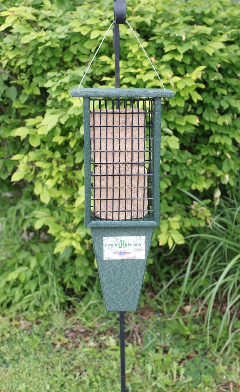 Hunter Green Recycled Plastic Double Suet Feeder with tail prop for the woodpeckers to balance with their tail. Accommodates the Pileated Woodpecker. Holds two standard size suet or seed cakes and is easy to clean and disinfect.