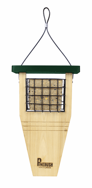 The Pinebush Suet Feeder allows woodpeckers to feed more comfortably. The addition of a tail prop lets the woodpeckers balance their tail and feed in an upright position. This suet feeder holds one standard sized suet cake.