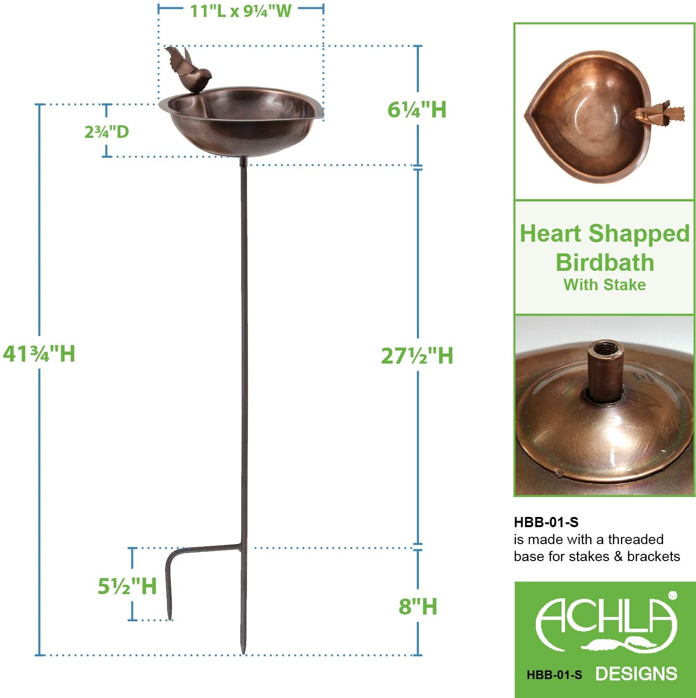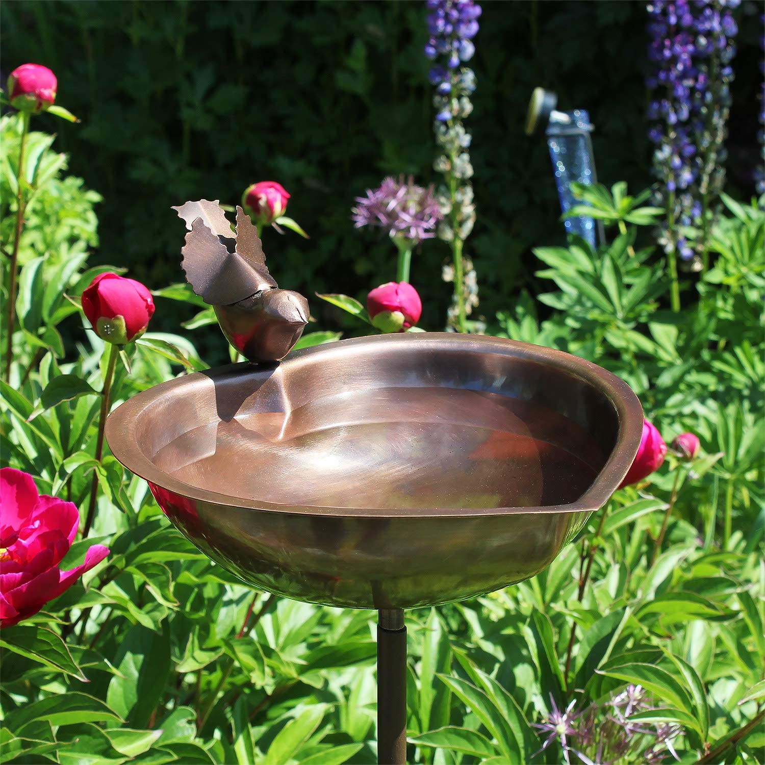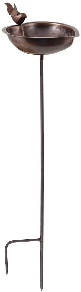 - HAND-MADE: The bowl is formed from stainless steel with a copper plating and an Antique finish. A small bird perches on the rim. Bowl measures 11-in L x 9 1/2"W x 4 3/4-in H. The underside of the bowl features a threaded base that attaches to the 36" wrought iron stake. The stake features a two-pronged design that prevents tipping and is finish with a Roman Bronze powder coating for maximum weather resistance.