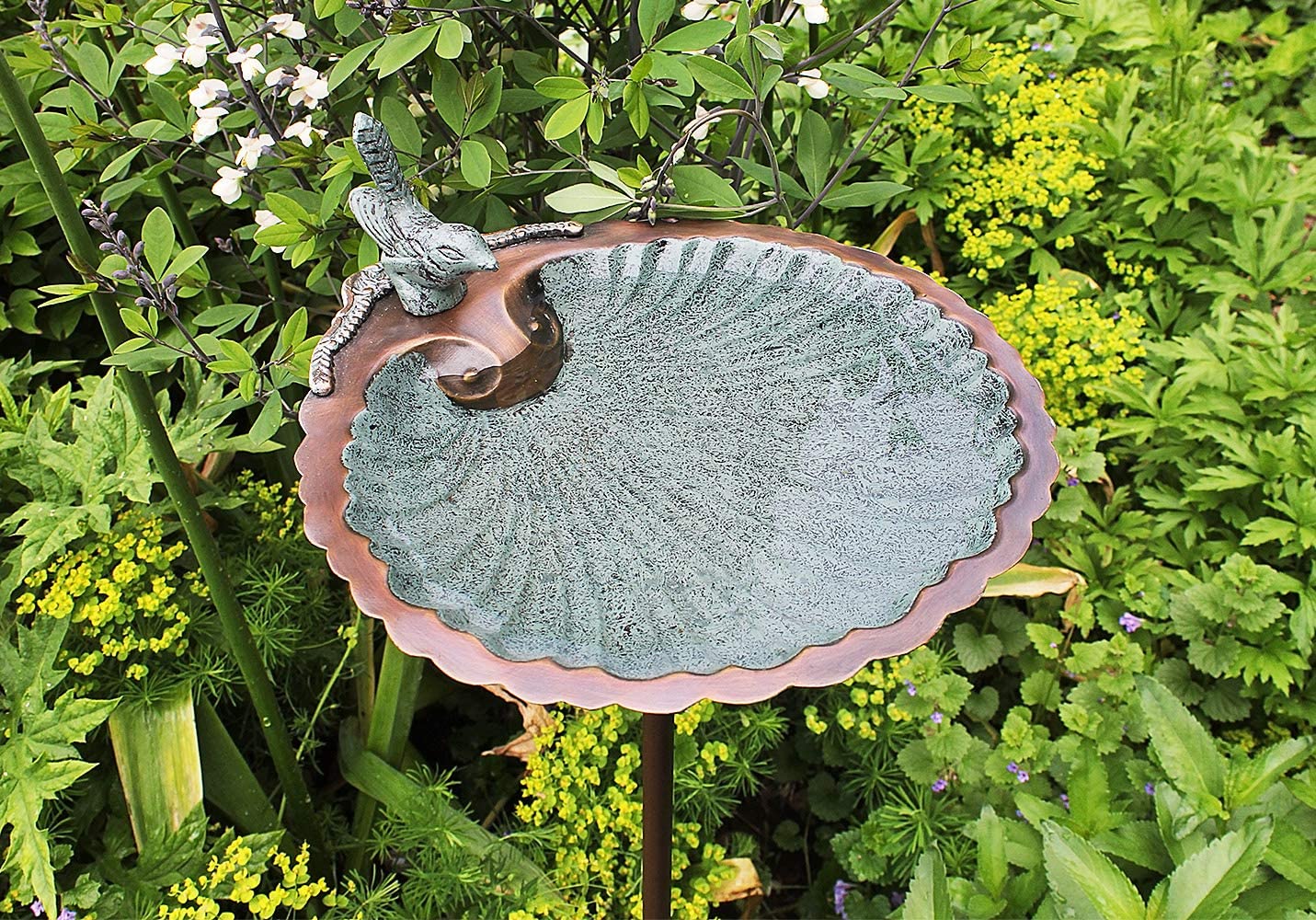 - HAND-MADE: The bowl is formed from solid brass with a copper plating and a Verdi patina finished interior. A small bird of cast aluminum perches on the rim. Bowl measures 11-in L x 11"W x 4-in H. The underside of the bowl features a threaded base that attaches to the 36" wrought iron stake. The stake features a two-pronged design that prevents tipping and is finish with a Roman Bronze powder coating for maximum weather resistance.
