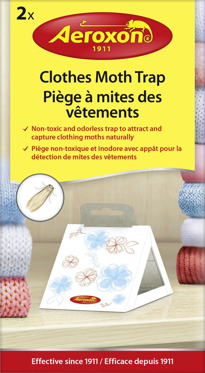 Non-toxic, odorless and ready-to-use monitor attractant trap for the detection of clothing moths on textiles, furs, carpets, curtains, upholstered furniture, mattresses and other fabrics. Effective 2 x 3 months.