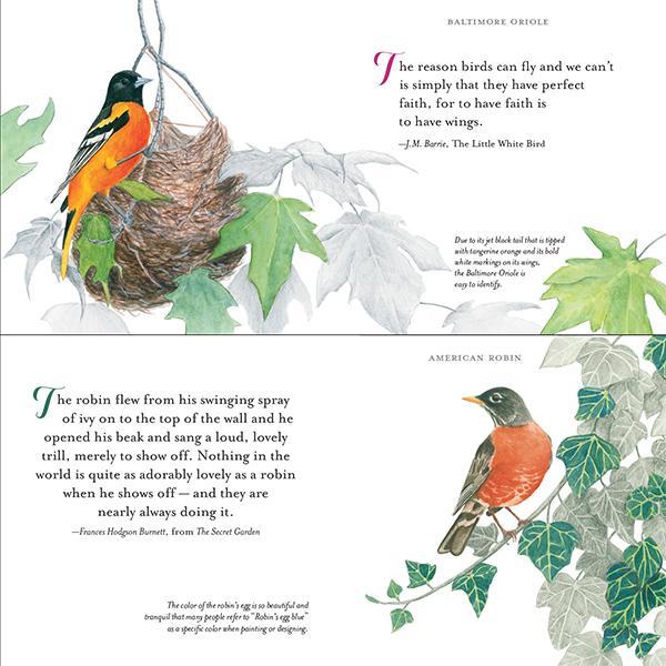 In Beautiful Songbirds, watercolor artist Ashley Halsey has carefully rendered illustrations of songbirds from North America and abroad. Each bird is pictured in their natural habitat and accompanied by uplifting quotations from poets, writers and naturalists. Also included are interesting facts about each bird.