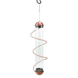 Patented spirals in this nyjer thistle feeder attract more birds. Nine seed ports on this feeder allow more birds to feed at one time. Birds love to perch on the patented spiral and they love to run along the spiral instead of flying to another perch. The lid is a Squirrel-proof patented locking lid. The feeder is easy to hang (looped 150-lb-test hanging wire included and attached) and easy to clean (patent-pending Twist &amp
