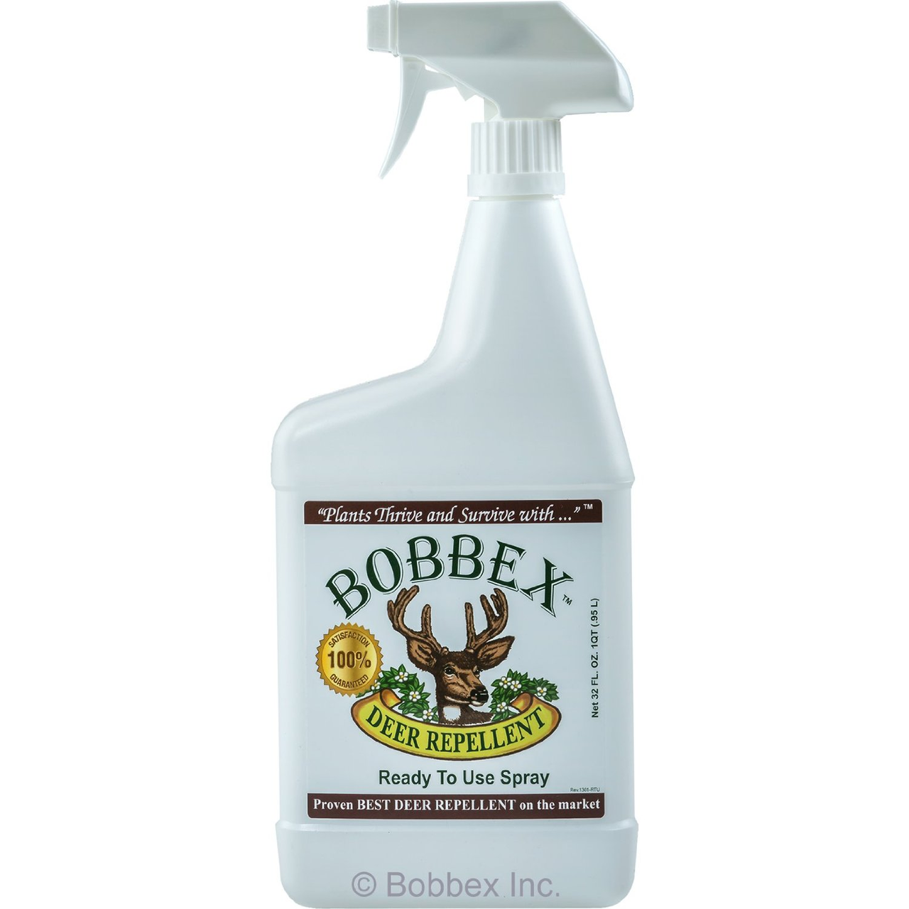 Bobbex Deer Repellent is an original, unique spray made from all natural and recycled ingredients. It is applied directly on the surface of foliage to repel deer. Bobbex is environmentally compatible and harmless to all wildlife including humans, pets, birds and aquatic life.  This Ready-to-Use 0.95 liter formula comes in a handy trigger spray bottle. Just give the bottle a good shake to mix the ingredients and spray away!