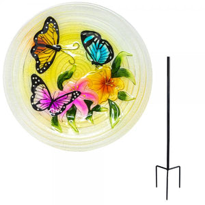 Beautiful Glass Bird baths. Songbird friendly with textured bottoms and correct depths. Glass design makes bird baths weather friendly. Attractive enough to display indoors, embossed with gorgeous and vibrant colors. 13 inches in diameter.