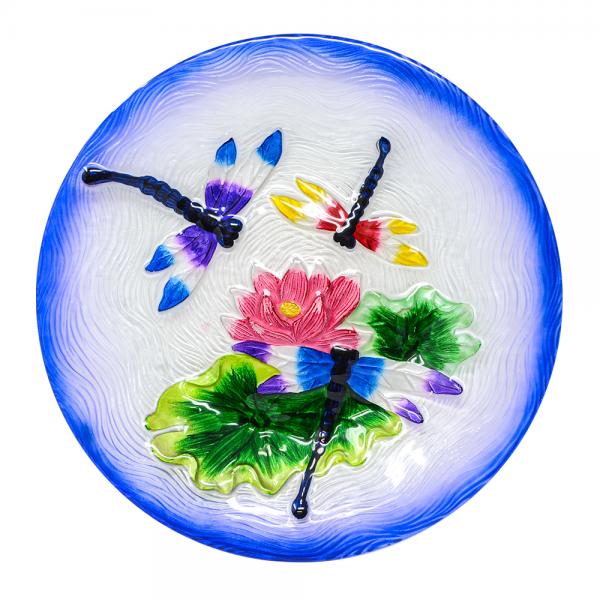 Beautiful Glass Bird baths. Songbird friendly with textured bottoms and correct depths. Glass design makes bird baths weather friendly. Attractive enough to display indoors, embossed with gorgeous and vibrant colors. 18 inches in diameter.