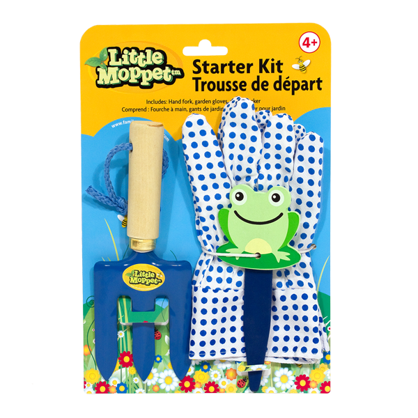 What better way to get acquainted with the garden than with a delightful Little Moppet Garden Starter Kit. Each kit includes a pair of blue polka dot garden gloves, a sturdy blue metal hand fork and a wooden frog-shaped plant marker.