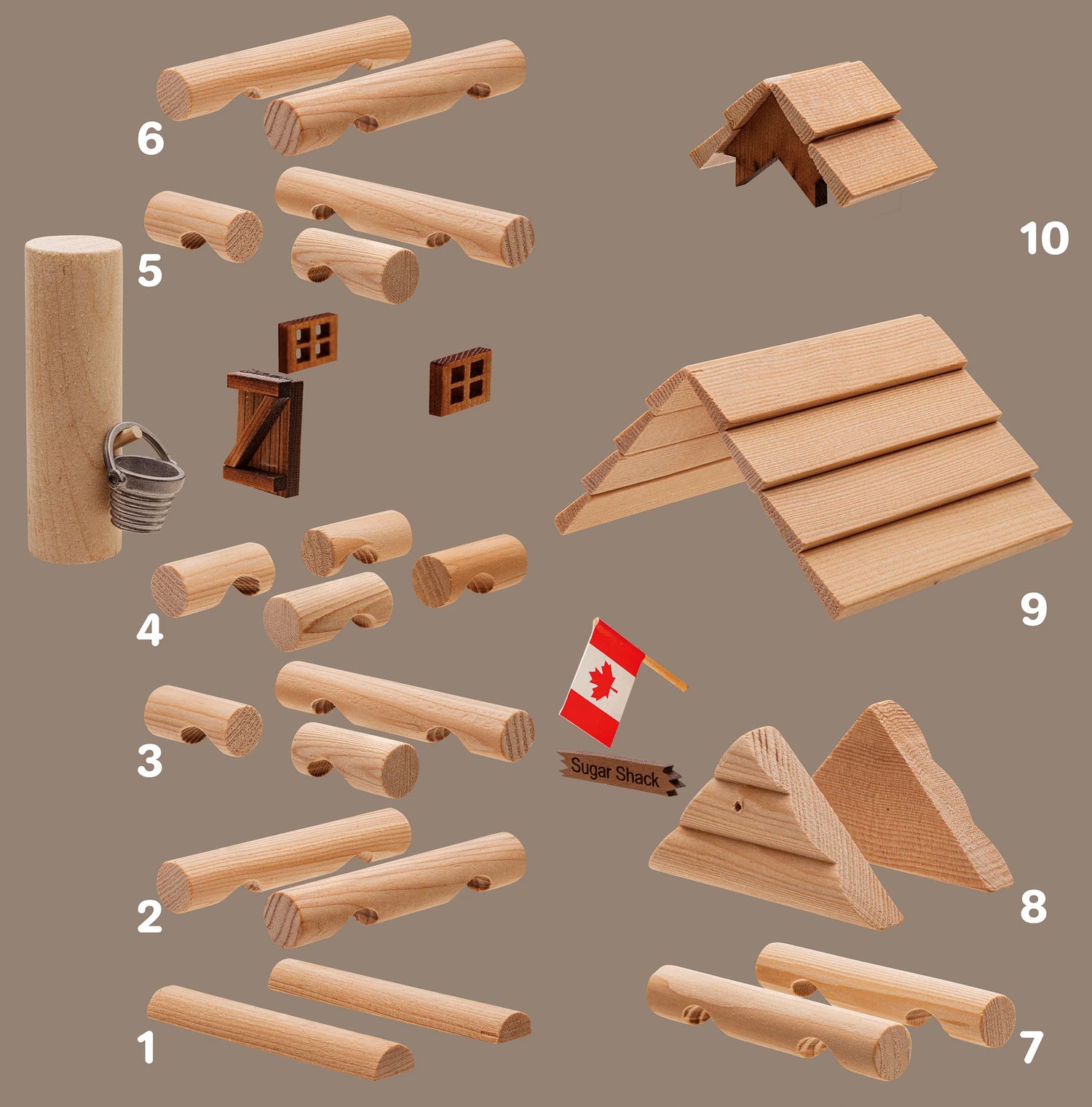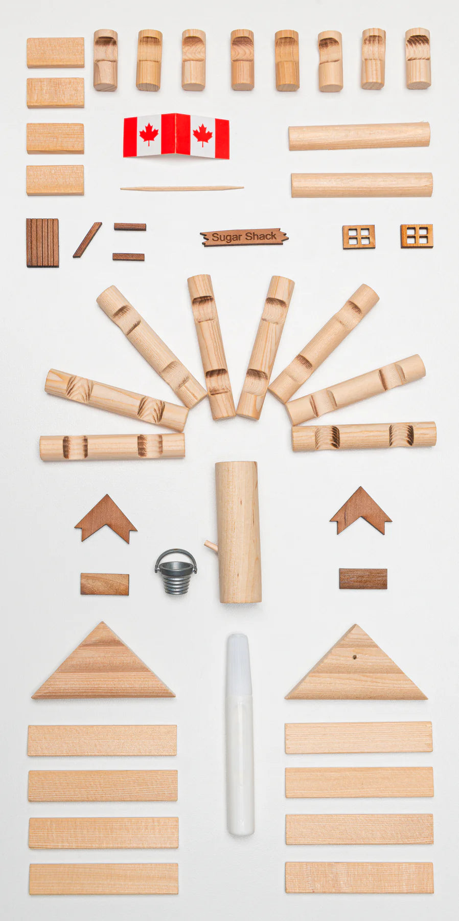 The Log Sugar Shack replicates the Cabane a Sucre of Eastern Canada where sap is transformed into delicious Canadian Maple syrup. The Sugar Shack comes complete with tree, bucket, detailed door, wooden framed windows, roof vent, flag and laser engraved sign. Choose one of the standard signs including “Sugar Shack” or have your Sugar Shack personalized with your own engraving using up to 24 characters. Like all of our models it also includes non-toxic white glue for safe and convenient assembly. Become an authentic maple syrup maker and hang the bucket on the tree to collect the sap. The Sugar Shack makes an excellent gift and a fantastic addition to the Log Cabin village. Collect them all and be transported back in time as you build your cabin using the same authentic log construction methods as the early settler’s.