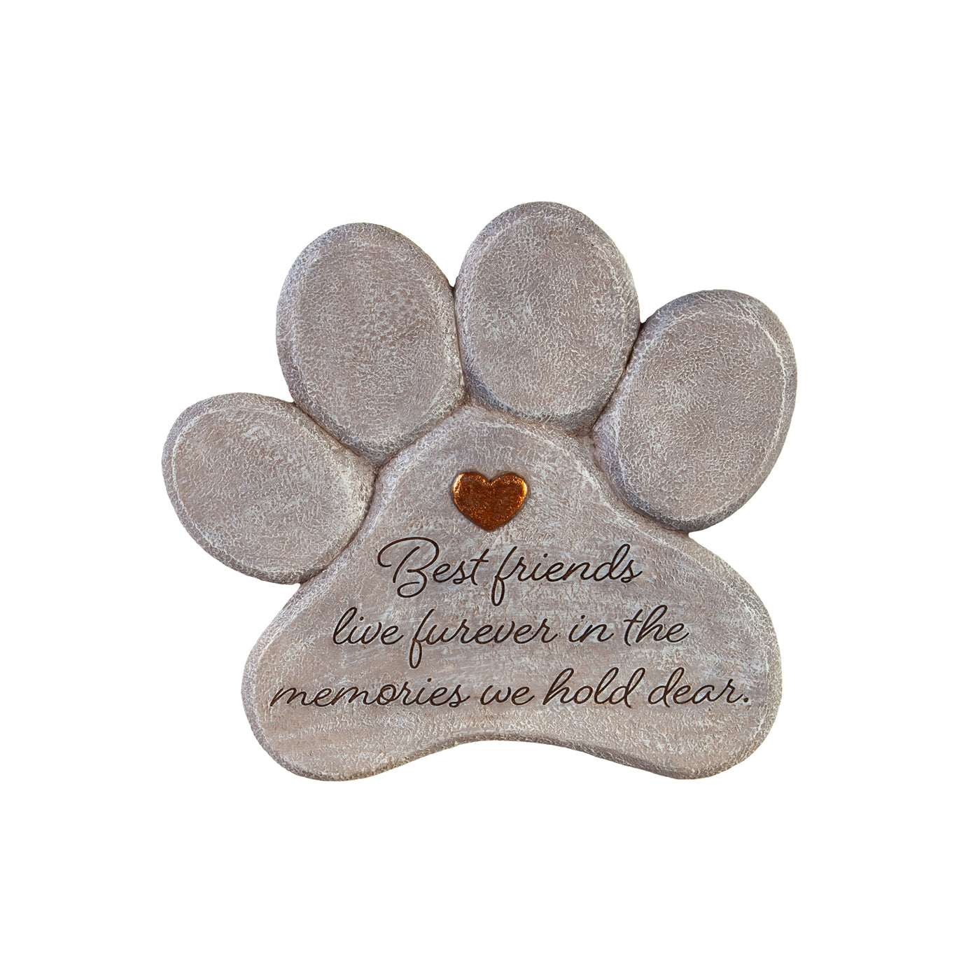 Perfect for customers that want to remember precious lost pets, this garden stone is shaped as a paw print and reads "Best friends live forever in the memories we hold dear." Measuring approximately 11 by 11 inches, this paw print stone has a single bronze heart and makes a perfect addition to homes that have just lost a furry friend. The outdoor-safe polyresin design is weather-resistant and won't fade over time.