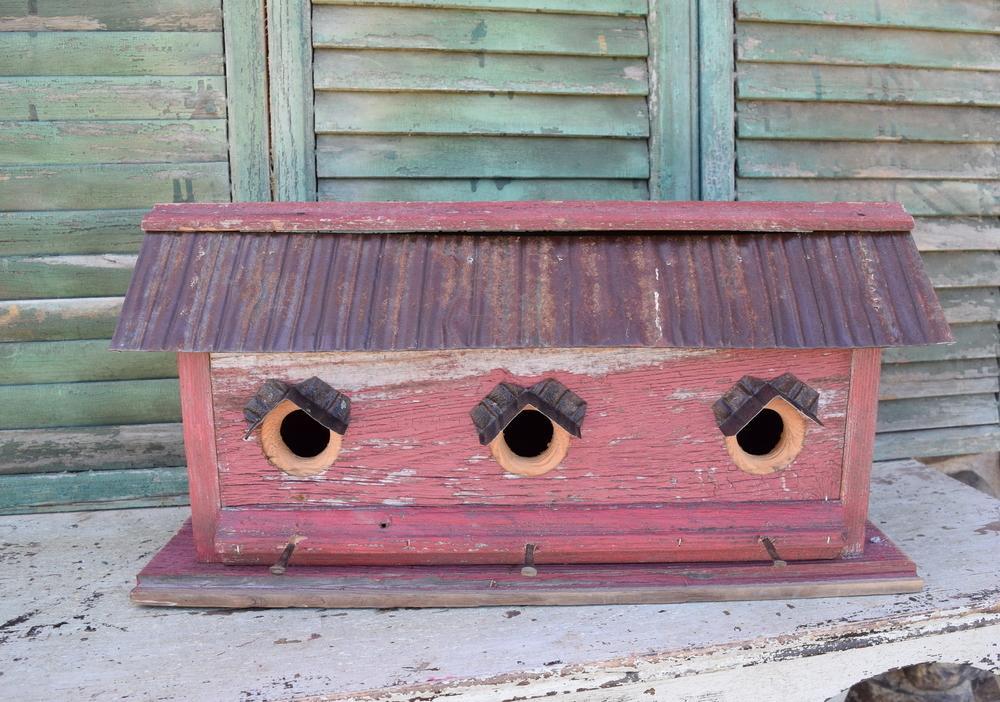 This house was handcrafted from recycled wood and metal from old barns in southeastern Illinois. Through the use of this recycled material (some being up to 100 years old), a decorative and nostalgic piece of folk art has been created. You can enjoy it as a wonderful accent indoors or adopt a bird family outdoors and provide them with a cozy shelter.