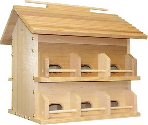 This 12 room starling resistant purple martin house is made of beautiful and long-lasting cedar. Mounting Pole sold separately. Masonite room dividers and floors. Roof lifts off and room dividers and floors lift out for easy cleaning. Features protective rails for small birds and entrance holes designed to discourage starlings from using the house. 19in x 21-1/2in x 18-1/2in high.