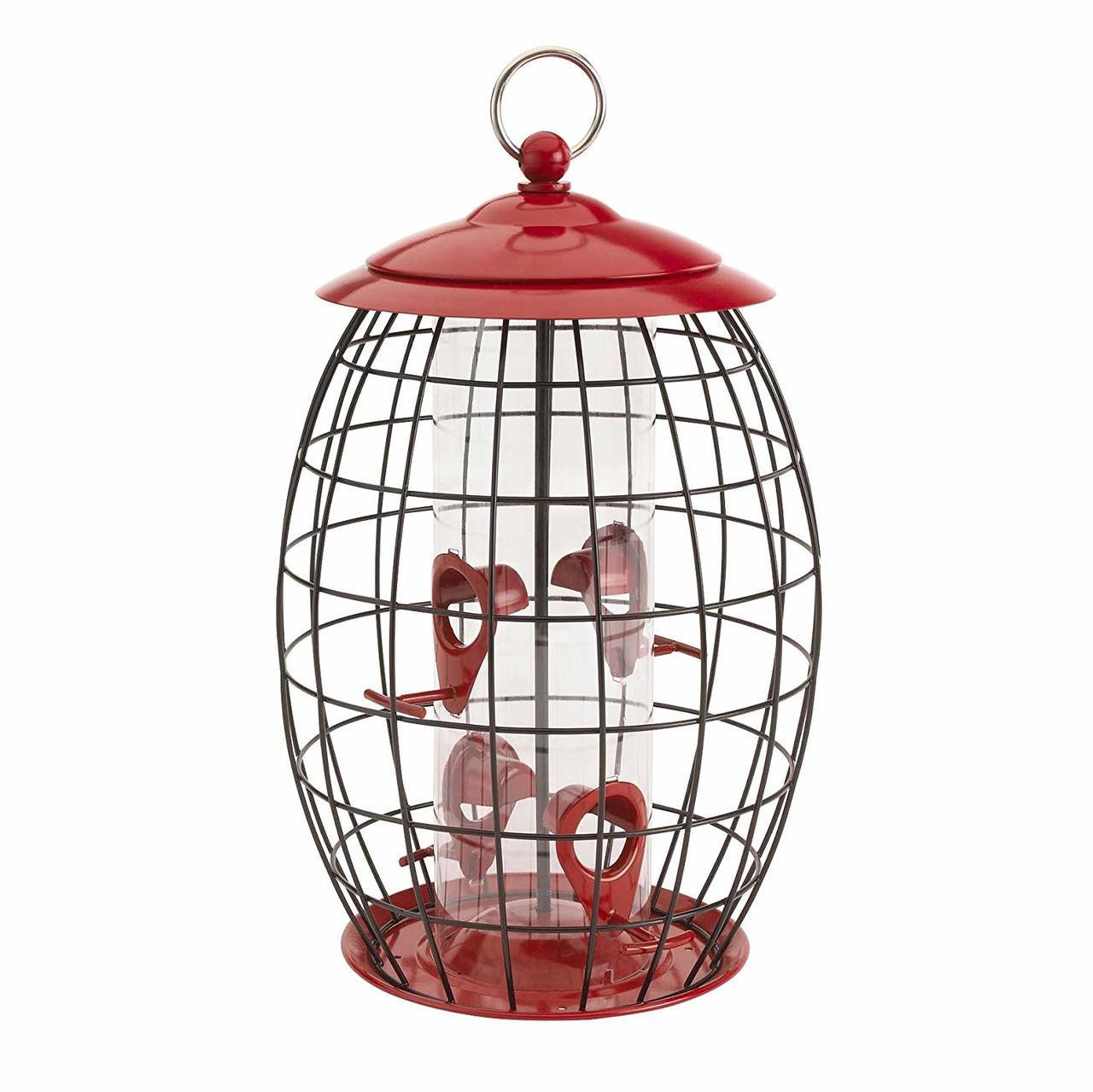 The durable metal cage surrounding the bird feeder has openings large enough to allow small and medium size birds to enter and be protected while feeding. The locking system prevents squirrels from lifting lid and accessing the seed. Built-in catch tray with drainage holes helps keep fallen seed fresh for birds.