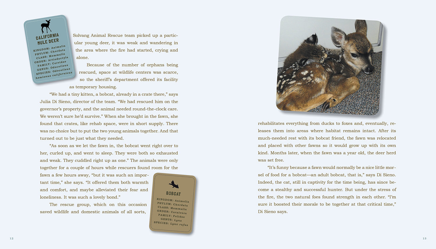Ms. Holland narrates the details and arc of each story, and also offers insights into why—how the young leopard, probably motherless, sought maternal comfort with the calf, and how a baby oryx inspired the same mothering instinct in the lionness. Or, in the story of Kizzy, a nervous retired Greyhound, and Murphy, a red tabby, how cats and dogs actually understand each other’s body language. With Murphy’s friendship and support, Kizzy recovered from life as a racing dog and became a confident, loyal family pet.
